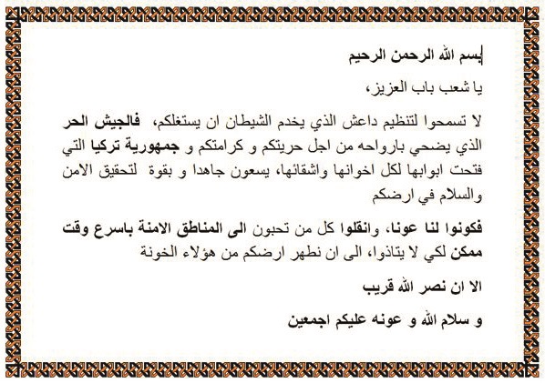 - El Bab bölgesinde TSK tarafından dağıtılan bildiri şöyle: “Bismillahirrahmanirrahim; Değerli El Bab halkı, Şeytana hizmet eden DEAŞ terör örgütünün sizi kullanmasına izin vermeyin. Sizin özgürlük ve felahınız için hayatını ortaya koyan Özgür Suriye Ordusu ve kardeşlerine her zaman kapısını açan Türkiye Cumhuriyeti, topraklarınıza huzuru ve güveni getirmek için tüm gücüyle çaba sarf etmektedir. Bize yardımcı olun ve biz topraklarınızı bu hainlerden temizleyene kadar zarar görmemeleri için sevdiklerinizi en kısa sürede güvenli bölgelere taşıyın. Zafer Allah'ın izni ile yakındır. Allah'ın selâmı ve desteği üzerinize olsun."