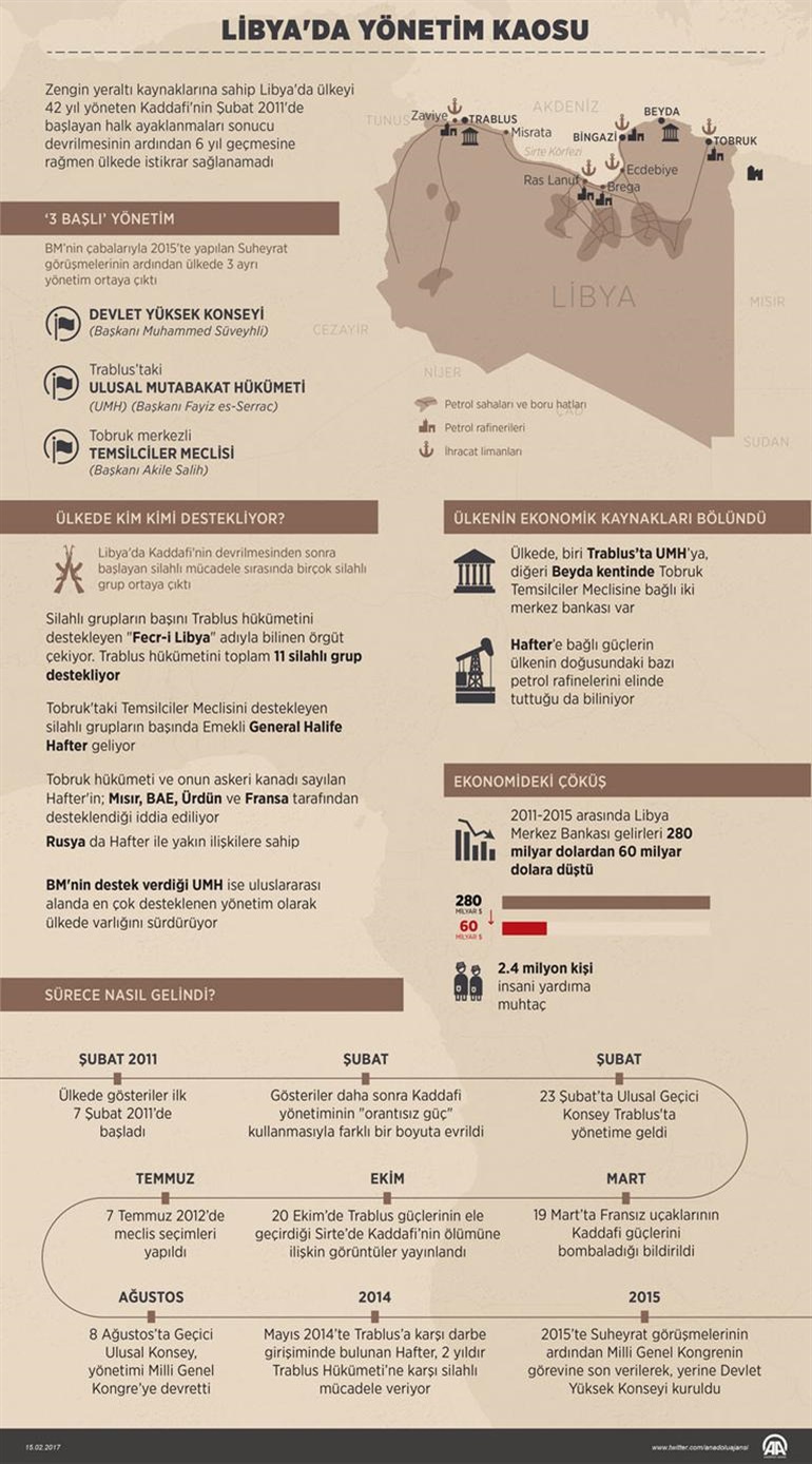 Zengin yeraltı kaynaklarına sahip Libya'da ülkeyi 42 yıl yöneten Muammer Kaddafi'nin Şubat 2011'de başlayan halk ayaklanmaları sonucu devrilmesinin ardından 6 yıldan fazla süre geçmesine rağmen ülkede istikrar sağlanamadı.