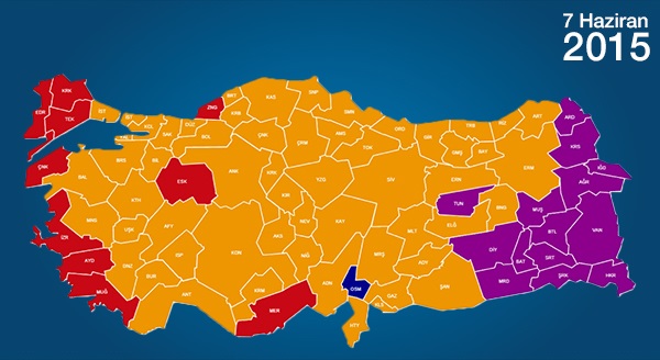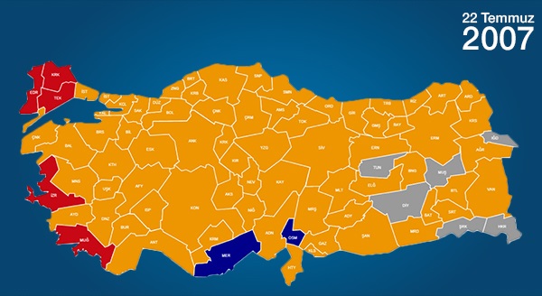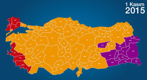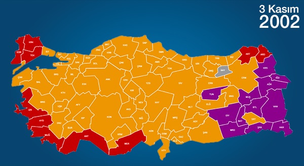 3 Kasım 2002, 22 Temmuz 2007, 12 Haziran 2011, 7 Haziran 2015 ve 1 Kasım 2015 seçimleri.. 2001’de kurulan ve bir buçuk yıl sonra girdiği ilk seçimlerde tek başına iktidar olan AK Parti, Türkiye’nin seçim haritasını değiştirmesiyle de tarihe geçti. 1999 seçimlerinde yüzde 10’luk seçim barajını geçen 5 parti ve bağımsızların rengini alan harita, 1 Kasım seçim sonuçları ile ilk defa 3 renkli oldu.