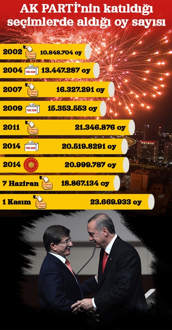 Türk siyasi tarihinde büyük bir başarıya imza atan AK Parti 1 Kasım seçimlerinde sandıktan zaferle çıktı. 7 Haziran'dan 5 ay sonra yapılan ikinci seçimde AK Parti kaybettiği illeri ve oyları geri aldı. 7 Haziran seçimlerinde yüzde 41 oy alan ancak hükümeti kuracak milletvekili çoğunluğunu yakalayamayan AK Parti, Hakkari, Şırnak ve Tunceli'de vekil çıkaramadı. AK Parti, 7 Haziran'da vekil çıkaramadığı Iğdır ve Ağrı'da birer vekil çıkardı. 7 bölgede oyunu artıran AK Parti, 316 vekil çıkardı. AK Parti, İç Anadolu ve Karadeniz'de MHP'ye, Doğu ve Güneydoğu illerinde de HDP'ye kaptırdığı oyları geri aldı. Yurt genelindeki 48 ilde milletvekili sayısını artıran AK Parti'nin, yeni dönemde parlamentoda 78 ilden temsilcisi bulunacak.