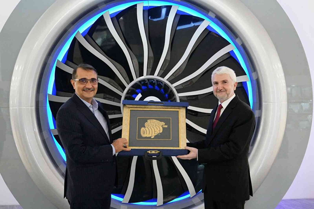TEI-TS1400 Millî motorun testlerinin gerçekleştirildiği, TEI’deki ekip tarafından oluşturulan millî bremzeyi de yerinde inceleyen Dönmez’e TEI Genel Müdürü Prof. Dr. Mahmut F. Akşit, TEI-TS1400 Turboşaft Motoru deseniyle işlenen hat sanatı eserini ziyaretin anısına takdim etti.