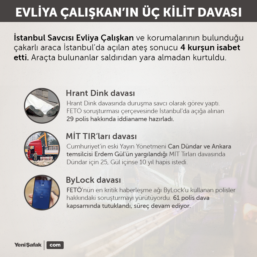 İstanbul Savcısı Evliya Çalışkan dün gece aracına düzenlenen silahlı saldırıdan yara almadan kurtulurken, saldırıya dair dikkati çeken detaylar gün yüzüne çıkıyor. Savcı Mehmet Selim Kiraz'ın şehit edildiği günleri akıllara getiren bu saldırı, FETÖ-DHKP/C ittifakını bir kez daha hatırlattı.