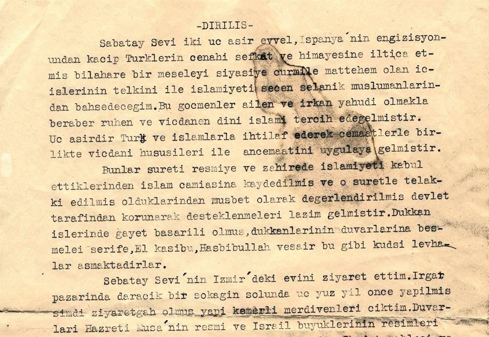 “Sabetay Sevi'nin İzmir'deki evini ziyaret ettim. Irgat Pazarı'nda daracık bir sokağın sonunda üç yüzyıl önce yapılmış şimdi ziyaretgah olmuş yapı. Kemerli merdivenleri çıktım. Duvarları Hz. Musa'nın resmi ve İsrail büyüklerinin resimleri ile süslü, sinagogu andıran taş sofada durdum. İbadet rahlesi ve üstünde mukaddes kitapları duruyordu. Sabetay Sevi burada dua edermiş. Ambarımsı odayı göstererek işte burada yatardı dediler. Bize mihmandarlık etmek nezaketini göstermiş İzmir Yahudi Cemaati mensuplarının Sabetay Sevi'nin hayatı ve yaşadıkları hakkında verdikleri izahatı hayrete düşerek dinledim."