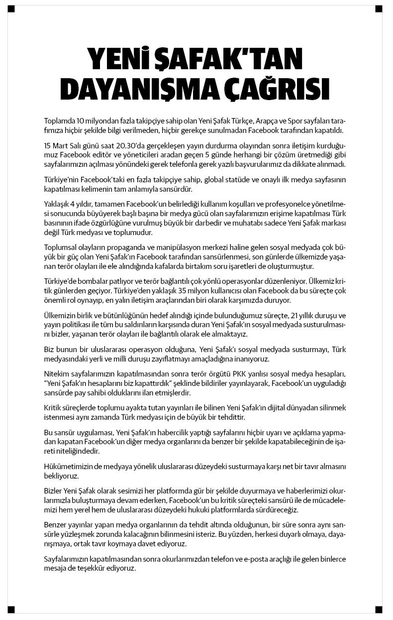 Yaklaşık 4 yıldır, tamamen Facebook'un belirlediği kullanım koşulları ve profesyonelce yönetilmesi sonucunda büyüyerek başlı başına bir medya gücü olan sayfalarımızın erişime kapatılması Türk basınının ifade özgürlüğüne vurulmuş büyük bir darbedir ve muhatabı sadece Yeni Şafak markası değil Türk medyası ve toplumudur.