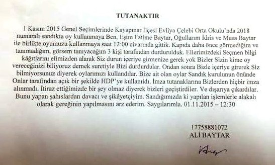 Sabahın erken saatlerinden itibaren başlanan oy kullanma işlemlerinde Diyarbakır'ın Kayapınar ilçesinde iddiaya göre bazı vatandaşlar adına zorla farklı kişilerce oy kullanıldığı öne sürüldü. İddianın sahiplerinden 70 yaşındaki Ali Baytar öğlen saat 12.00 sıralarında eşi Fatime ve çocukları İdris ve Musa Baytar ile birlikte oy kullanacağı Evliya Çelebi Ortaokulu'na gitti. Baytar ve ailesi okula girişleri sırasında tanımadıkları üç kişi tarafından önce durdurulduklarını belirterek ardından kendileri adına üç kişinin oy kullandığını söyledi. Yaşadıkları duruma karşı çıktıklarını belirten Ali Baytar elindeki tutanakla birlikte şikayette bulunacağını dile getirerek şunları söyledi: