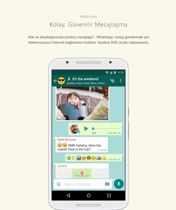 Aile ve arkadaşlarınızla ücretsiz mesajlaşın*. WhatsApp, mesaj göndermek için telefonunuzun İnternet bağlantısını kullanır, böylece SMS ücreti ödemezsiniz.