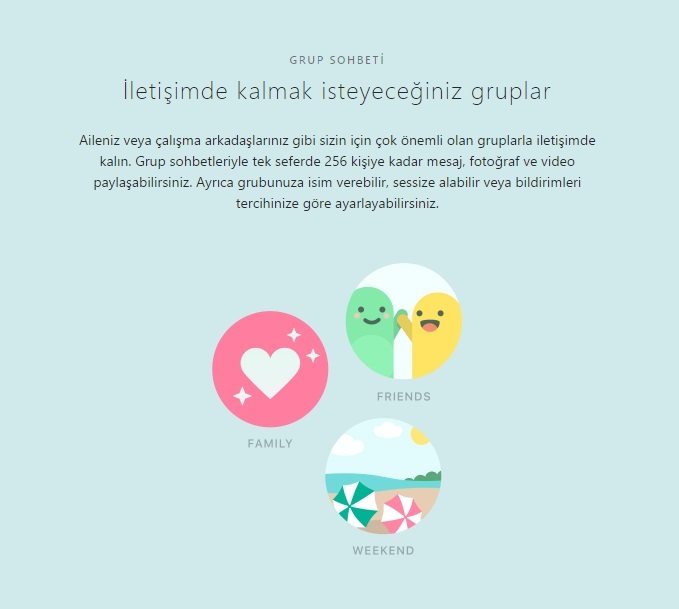 Aileniz veya çalışma arkadaşlarınız gibi sizin için çok önemli olan gruplarla iletişimde kalın. Grup sohbetleriyle tek seferde 256 kişiye kadar mesaj, fotoğraf ve video paylaşabilirsiniz. Ayrıca grubunuza isim verebilir, sessize alabilir veya bildirimleri tercihinize göre ayarlayabilirsiniz.