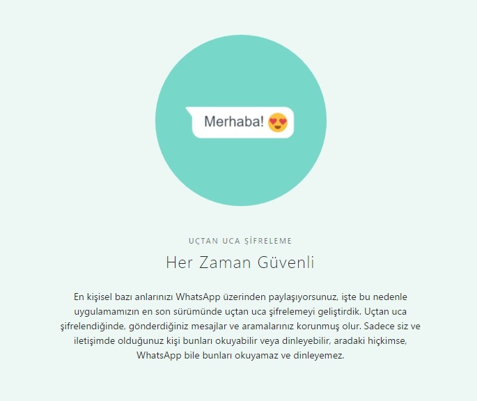 En kişisel bazı anlarınızı WhatsApp üzerinden paylaşıyorsunuz, işte bu nedenle uygulamamızın en son sürümünde uçtan uca şifrelemeyi geliştirdik. Uçtan uca şifrelendiğinde, gönderdiğiniz mesajlar ve aramalarınız korunmuş olur. Sadece siz ve iletişimde olduğunuz kişi bunları okuyabilir veya dinleyebilir, aradaki hiçkimse, WhatsApp bile bunları okuyamaz ve dinleyemez.