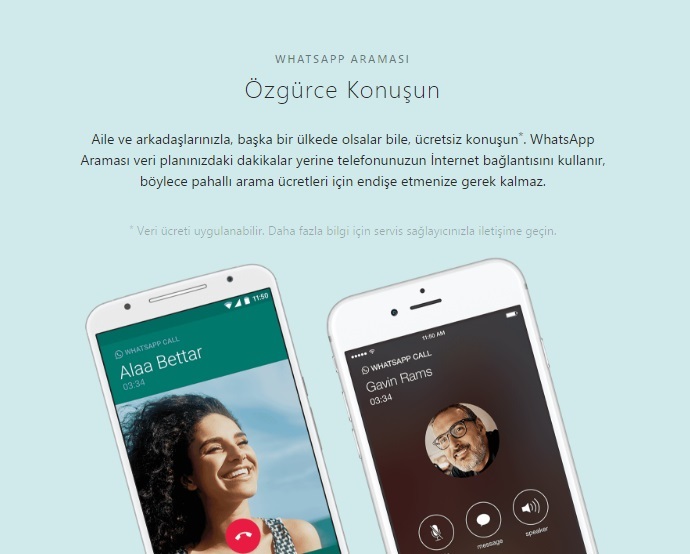 Aile ve arkadaşlarınızla, başka bir ülkede olsalar bile, ücretsiz konuşun*. WhatsApp Araması veri planınızdaki dakikalar yerine telefonunuzun İnternet bağlantısını kullanır, böylece pahallı arama ücretleri için endişe etmenize gerek kalmaz.