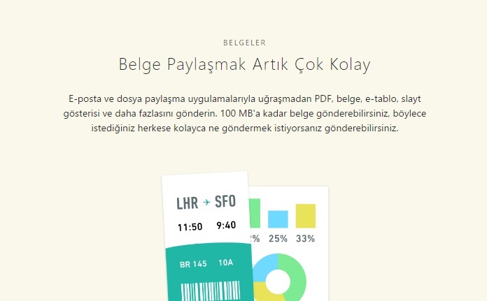 E-posta ve dosya paylaşma uygulamalarıyla uğraşmadan PDF, belge, e-tablo, slayt gösterisi ve daha fazlasını gönderin. 100 MB'a kadar belge gönderebilirsiniz, böylece istediğiniz herkese kolayca ne göndermek istiyorsanız gönderebilirsiniz.