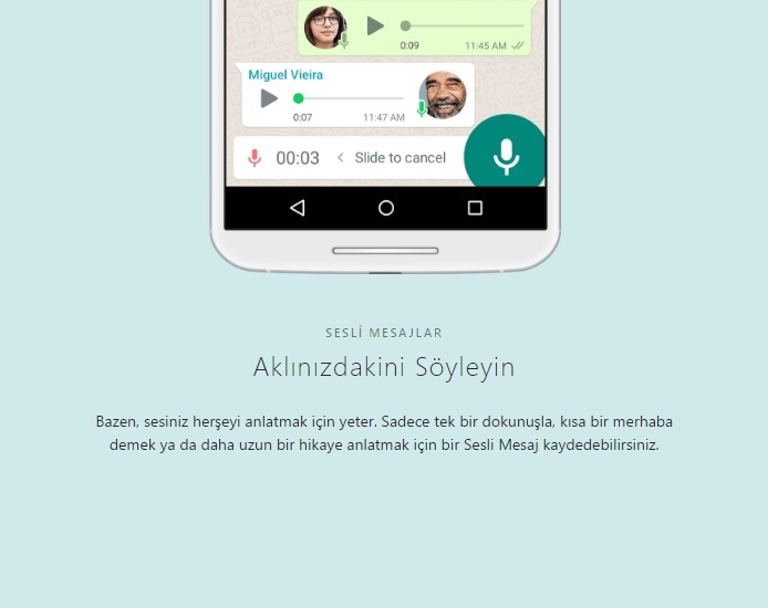 Bazen, sesiniz herşeyi anlatmak için yeter. Sadece tek bir dokunuşla, kısa bir merhaba demek ya da daha uzun bir hikaye anlatmak için bir Sesli Mesaj kaydedebilirsiniz.