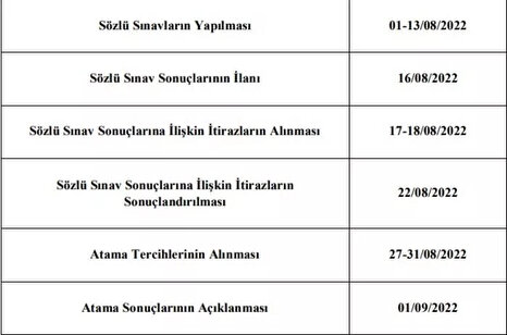 1-13 Ağustos tarihlerinde yapılan sözlü sınavların sonuçları 16 Ağustos'ta ilan edilecek adaylar 17-18 Ağustos tarihlerinde sınav sonuçlarına itiraz edebilecekler.