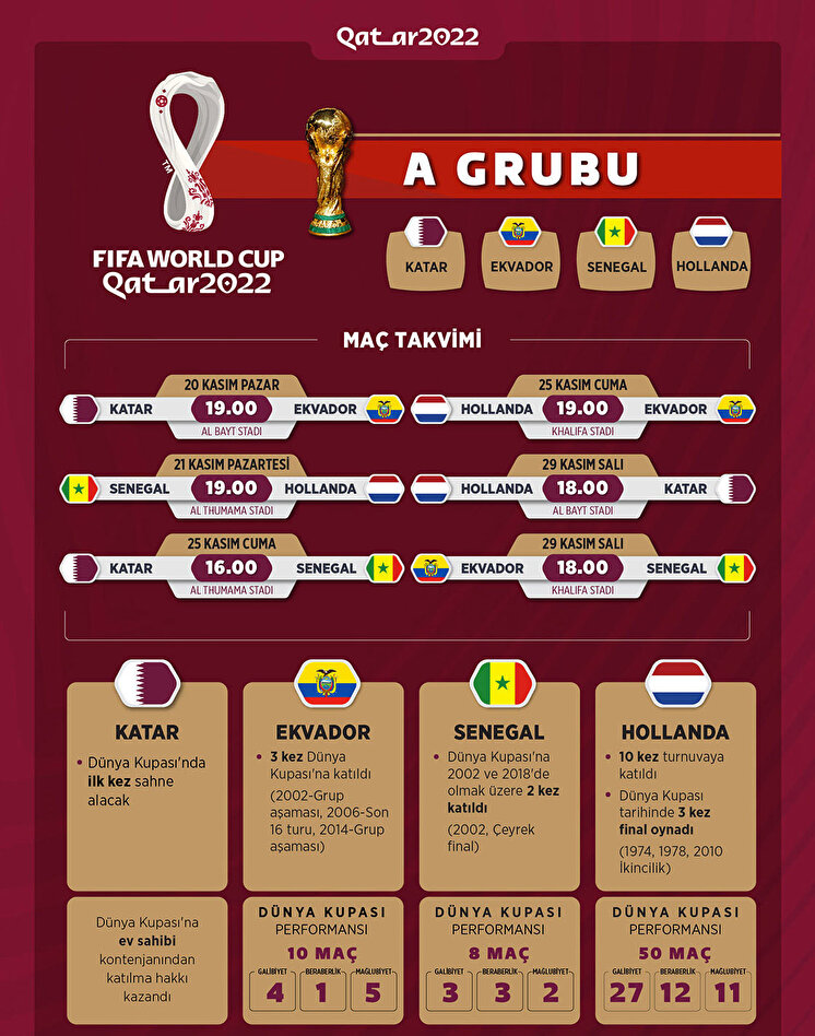 2022 Dünya Kupası heyecanı Katar'da başlıyor. 2022 FIFA Dünya Kupası, ev sahibi Katar ile Ekvador arasında yapılacak açılış maçıyla başlayacak. Toplam 32 takımın katılacağı futbolun milli takımlar düzeyindeki bir numaralı organizasyonu, 18 Aralık'ta oynanacak final maçıyla tamamlanacak. Peki 2022 Dünya Kupası A Grubu takımları hangileri? Dünya Kupası A Grubu maçları ve fikstür.