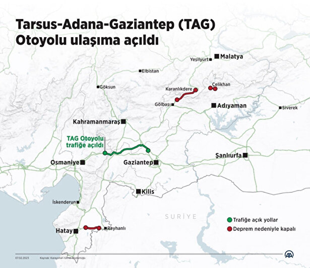 Karayolları Genel Müdürlüğü, Kahramanmaraş merkezli depremlerden etkilenen TAG Otoyolu'nun ulaşıma açıldığını ve güzergahta trafiğe engel herhangi bir sorun bulunmadığını bildirdi.