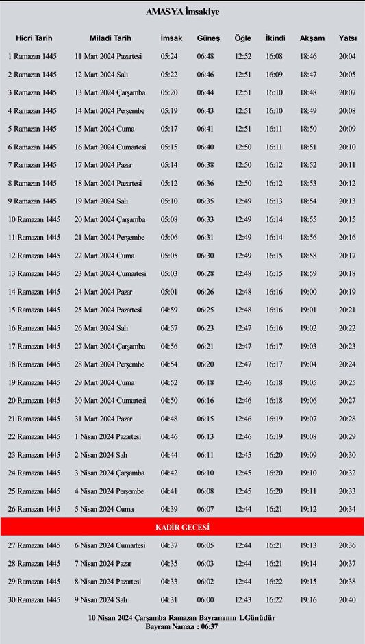Amasya Ramazan imsakiyesi 2024 imsak, sahur, iftar, akşam ezan saatleri