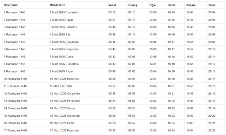 Mübarek Ramazan ayı Müslümanlar için rahmet, mağfiret ve Kur'an ayı olarak bilinmektedir. Ramazan ayının yarısına yaklaştığımız bu günlerde imsak vakitleri de sorgulanmaya devam ediyor. Ankara'da sahur vakti yaklaşırken bu aramalar da arttı. Tüm illerde farklılık gösteren sahur vakitleri Diyanet'in yayınladığı İmsakiye üzerinden takip edilebiliyor. İşte 11 Mart 2025 Ankara için sahur vakti.