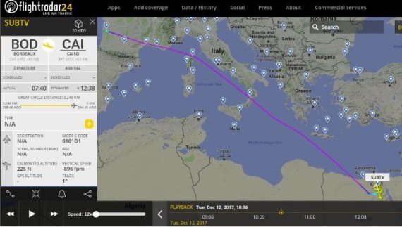 فيما كانت آخر الرحلات التي سجلها الموقع للطائرة صاحبة الرمز "SUBTV" صباح يوم اﻷحد، فخرجت من قاعدة ألماظة في الثامنة والنصف صباحاً، وصولاً لنقطة على ساحل البحر اﻷبيض المتوسط، قرب منطقة الضبعة.