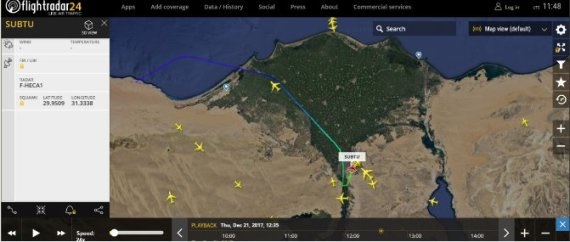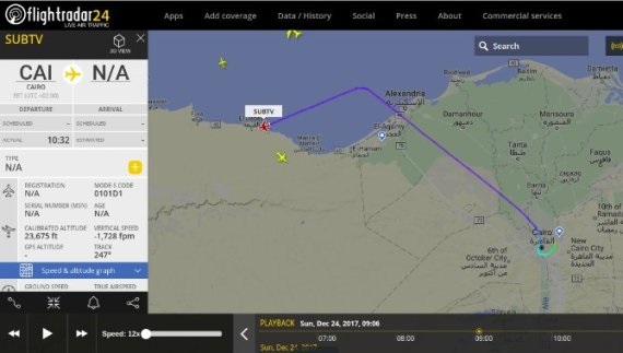 كما أمكن عبر الموقع ذاته رصد عدة رحلات للطائرتين داخل الأراضي المصرية، بعد ظهر الخميس 21 ديسمبر/كانون الأول، وشملت الرحلات إقلاع الطائرة صاحبة رمز التسجيل "SUBTV" من القاهرة، متجهة إلى الشمال الغربي نحو محافظة مطروح، لتختفي عن التعقب في منطقة جنوبي مدينة الضبعة، دون أن تظهر بيانات الموقع مطاراً للهبوط.