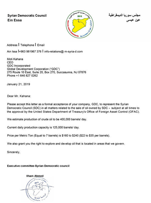 والتقت الإرهابية إلهام أحمد باثنين من المدراء التنفيذيين للشركة الإسرائيلية، وقدمت لهما ضمانات خطية "بأحقية الشركة بالتصرف بالنفط السوري في مناطق سيطرة بي كا كا الإرهابية.