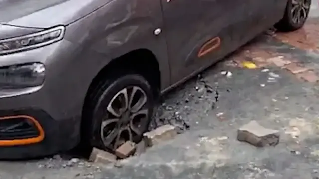 Küçükçekmece'de kapatılmayan çukur yolu çökertti: Araç çukura düştü