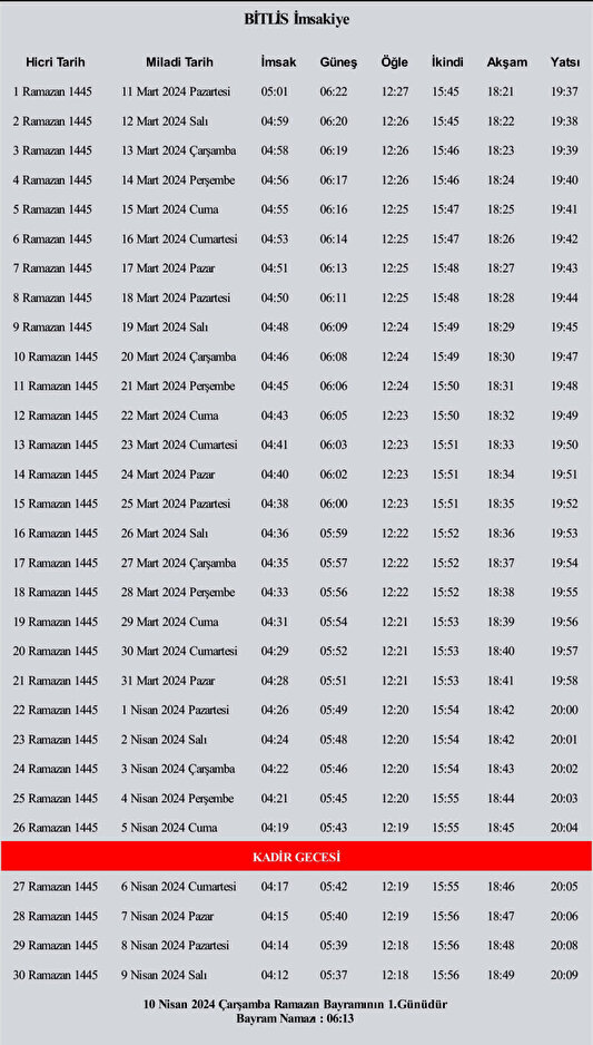Bitlis Ramazan imsakiyesi 2024 namaz vakitleri, sahur, iftar, akşam ezan saati