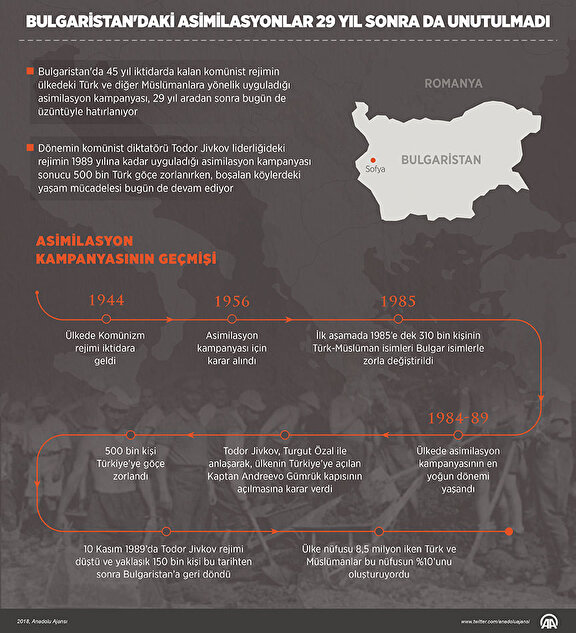 - Eski Sovyet Sosyalist Cumhuriyetler Birliğinin (SSCB) desteğiyle 1944'te hükümeti devirerek yönetimi ele geçiren Bulgaristan Komünist Partisi (BKP), iktidarda kaldığı 45 yıllık dönemin son yıllarında ülkedeki Türk ve diğer Müslümanları asimile etmeye çalıştı.