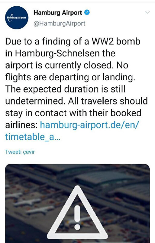 Almanya'nın Hamburg-Schenelsen Havalimanı'nda 2. Dünya Savaşından kalma patlamamış bomba bulunması nedeniyle havalimanı uçuşlara kapatıldı. THY'nin TK1667 sefer sayılı İstanbul- Hamburg seferini yapan uçağı da havalimanının kapatılmasının ardından bir müddet Hamburg hava sahasında tur attıktan sonra Bremen'e indi. Dönüş seferi olarak planlanan Hamburg-İstanbul seferi de iptal edildi. Gece yarısı etkisiz hale getirilen bombanın ardından havalimanı yeniden uçuşlara açıldı.