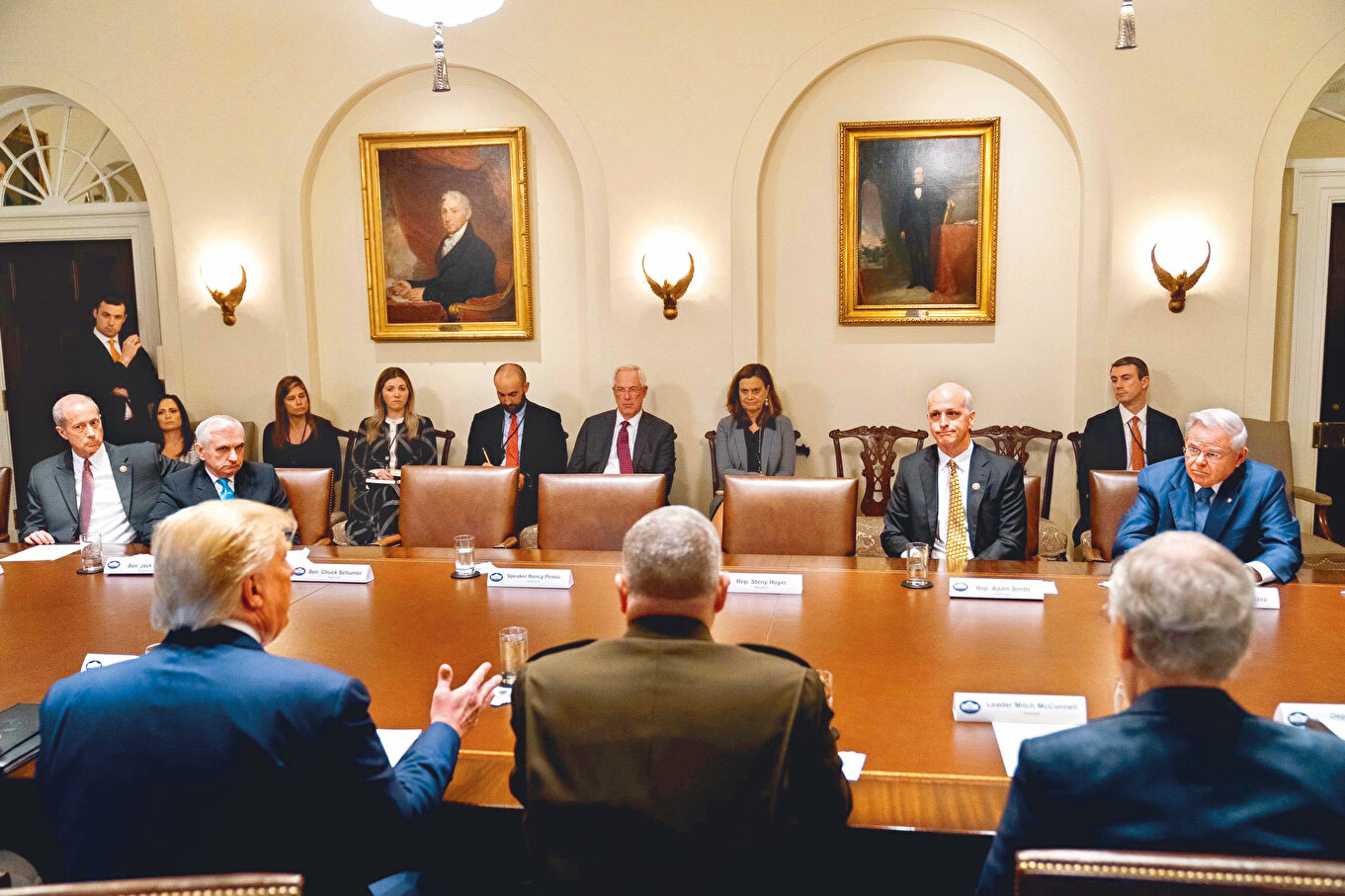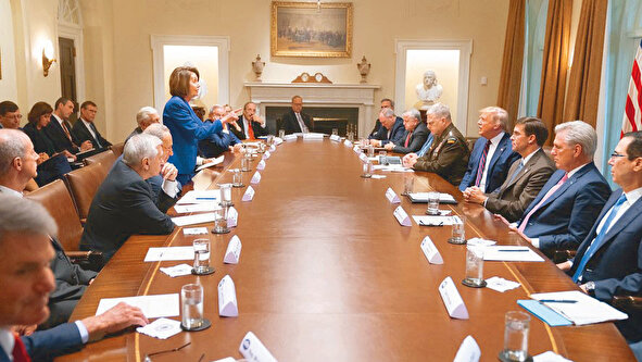 ABD Başkanı Donald Trump’ın önceki gün Beyaz Saray’da Kongre’deki Cumhuriyetçi ve Demokrat partinin önde gelen senatörleriyle biraraya geldiği toplantı yüksek gerilime sahne oldu. Masada, Trump yönetiminin Suriye politikası ve Türkiye’nin düzenlediği Barış Pınarı Harekatı konuşulacaktı ancak toplantı Trump’ın Temsilciler Meclisi Başkanı Nancy Pelosi’ye sarf ettiği sözler nedeniyle olaylı sona erdi. ABD Temsilciler Meclisi, Temsilciler Meclisi Dış ilişkiler Komitesi Demokrat Vekil Eliot Engel ve Cumhuriyetçi Michael McCaul tarafından, Beyaz Saray’ın “Barış Pınarı Harekatı” dolayısıyla “bölgeden çekilme” kararına tepki amacıyla sunulan karar tasarısını 60’a karşı 354 oyla onaylamıştı.