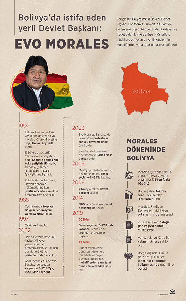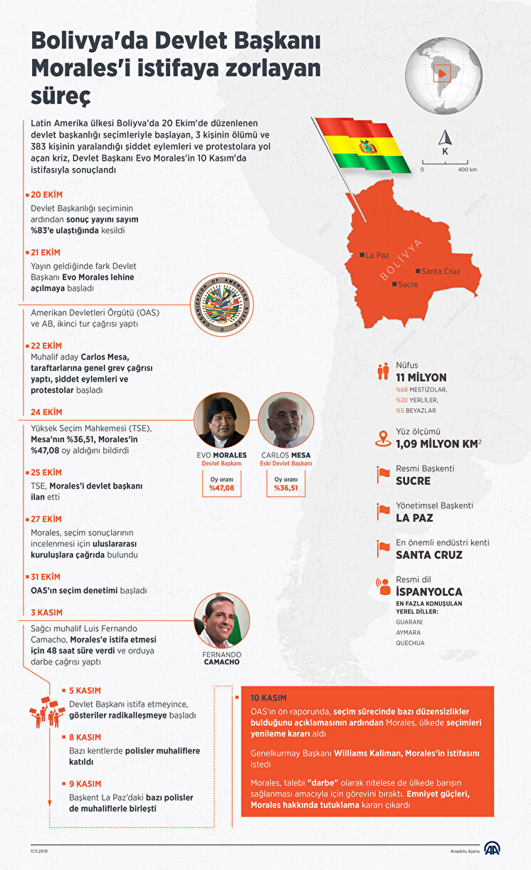 Morales, ülkedeki muhalif gösteri ve şiddet eylemlerine müdahale etmeyen ordunun talebi ve sokak olayları çıkaran muhaliflerin baskısıyla istifa ettiğini açıklamıştı.