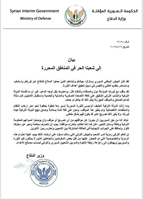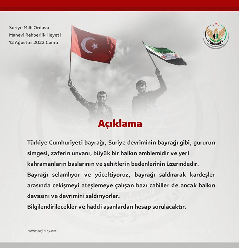 "Türk hükümeti ve halkı her zaman devrimi destekledi. Bunu ancak cahiller ve nankörler inkar edebilir. Suriye devriminin ana müttefiki olan Türk devleti, rejimi ve ayrılıkçı örgütleri yenmek için bizimle beraber hareket etmektedir ve bu duruşu değişmemiştir. Türk bayrağının toprağımızda kanı dökülen Türk ordusu için bir değeri vardır. Buna saygı göstermeliyiz."