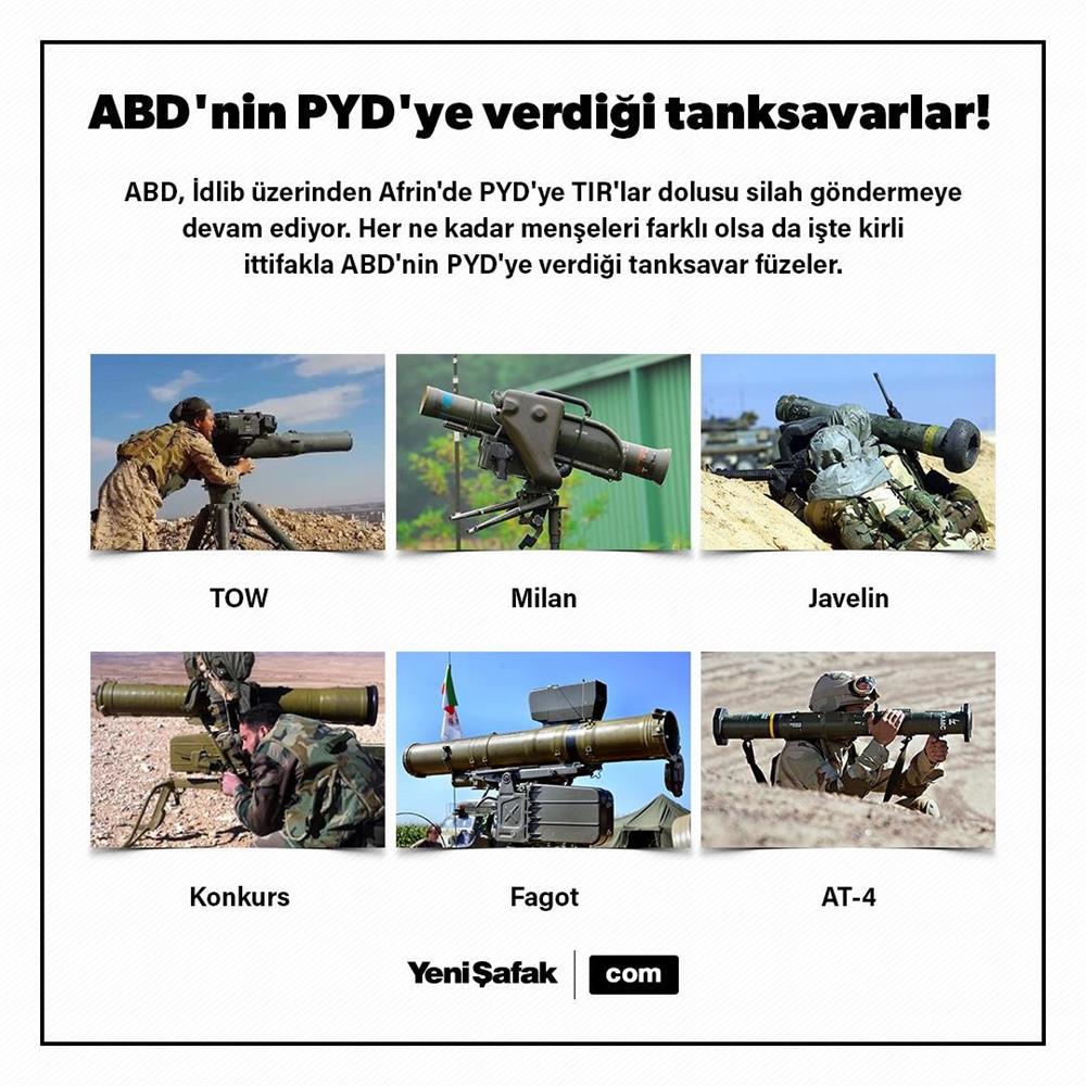 Son olay, PKK’ya şimdiye dek TOW, Milan, Javelin, Konkurs, Fagot, AT-4 tiplerinde binin üzerinde tanksavar füzesi gönderdiği bilinen Pentagon/CIA’nın, teröristlere destekten hiç vazgeçmediğini ortaya koydu. Yeni Şafak’ın muhaliflerden aldığı bilgiye göre, silah yüklü araçları Afrin’e sevk edenler, İdlib’de konuşlu ABD bağlantılı gruplar. Pentagon/CIA tarafından bölgede ‘doğrudan’ yönetilen bu gruplara verilen silahlar İdlib’in değişik yerlerinde istifleniyordu. Gizli depolardaki mühimmat ve füzeler, PKK’nın ihtiyacı doğrultusunda ve Amerikalıların emriyle bir süredir ‘örtülü şekilde’ Afrin’e gönderiliyor.