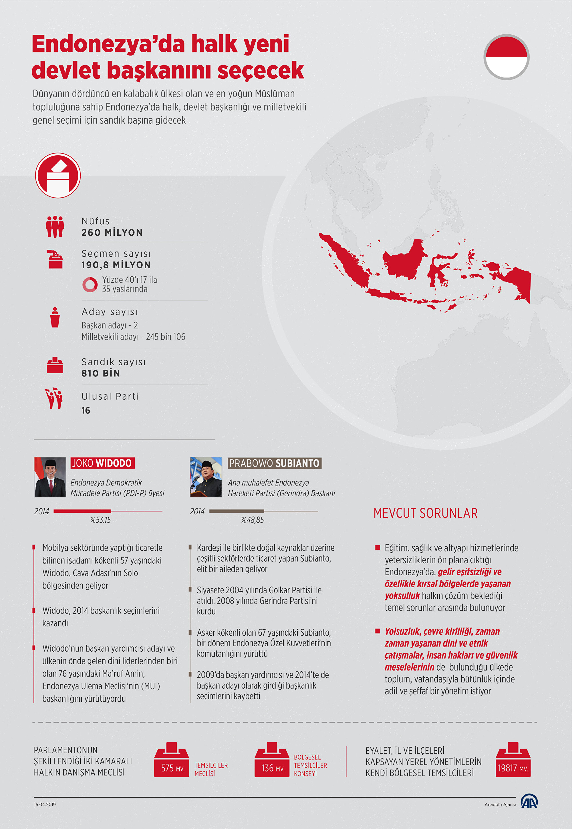 Endonezya'da 190 milyondan fazla seçmen, devlet başkanlığı ve milletvekili seçimi için sandık başına gidecek. Devlet başkanlığı için mevcut Devlet Başkanı Joko Widodo ve ana muhalefet partisi Gerindra'nın Genel Başkanı Prabowo Subianto yarışacak. Seçiminde iki adayın yarışması nedeniyle ikinci tura gerek kalmadan en fazla oyu alan devlet başkanı seçilecek.