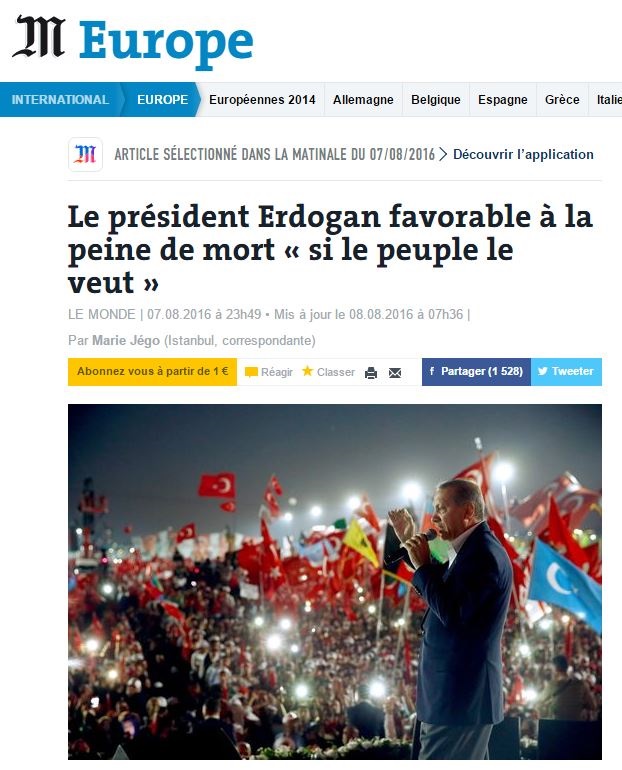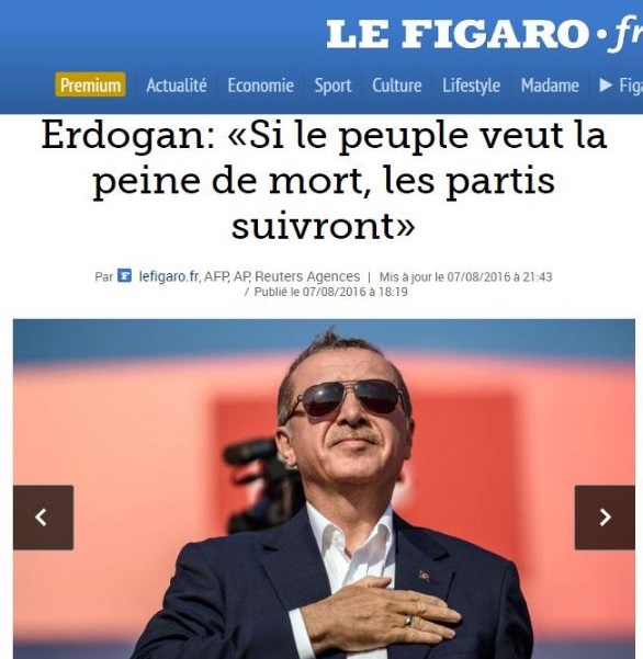 Fransız gazete Le Monde, Cumhurbaşkanı Erdoğan'ın idamla ilgili sözlerini öne çıkardı. Le Monde, sadece Türk bayrağının dalgalandığına vurgu yaparak, idam cezasının geri gelebileceğini yazdı.