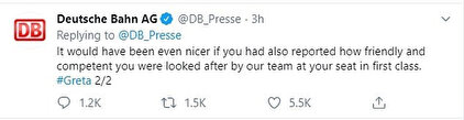 Greta'ya sosyal medya üzerinden cevap veren Deutsche Bahn, "Birinci sınıf koltuklarda yaptığınız seyahatten ve birinci sınıf ekibimizin ne kadar dostça ve yetenekli olduğunuzdan bahsetseydiniz daha iyi olurdu" ifadelerini kullanarak Greta ile dalga geçti.