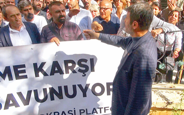 Nusaybinli bir vatandaş, açıklama için hazırlık yapan gruba tepki gösterdi. Göğsünden çıkardığı Türk bayrağını açan kişi,