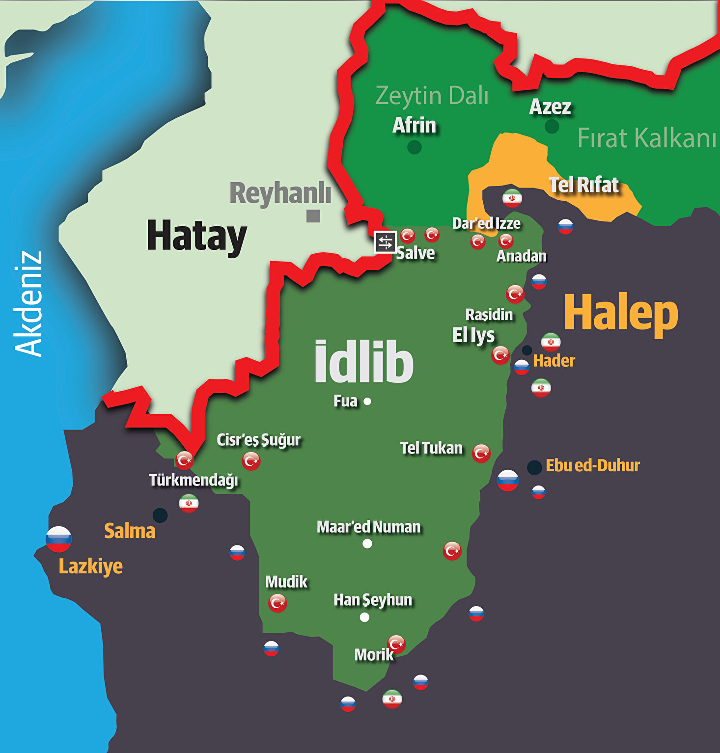 “Bir yandan sivil halkı korkunç bombardımana maruz bırakan Esed ve müttefikleri diğer yandan bölgeye sızdırdığı ajanlarla Türkiye ve Erdoğan aleyhine insanları kışkırtmaya çalışıyor. Farklı bölgelerden gelen siviller arasında 400’den fazla Muhaberat ajanı sızdırdılar. Camilerde, savaşçılar arasında, okullarda, yerel meclis ve diğer sivil toplum örgütleri ile birlikte halk arasında fitne yayarak Türkiye’ye karşı insanları sokağa dökme, protesto gösterileri yaptırmak istiyorlar. Bu yönde birkaç küçük hadise oldu ancak halk olayın bir tahrik ve provokasyon olduğunu gördü. Bu isimlerden bir kısmı yakalanarak planı deşifre etti.”