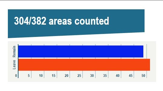 30 bölgede oy kullanan 1 milyon 966 bin 445 seçmenden 1 milyon 40 bin 97'si AB'den ayrılma, 926 bin 348'si ise AB'de kalmak yönünde tercihte bulundu. Birlikten ayrılmak isteyenlerin yüzde 53'lük oy oranıyla önde olduğu şu ana kadarki sonuçlarda, iki taraf arasında 113 bin 749 oy farkı var.