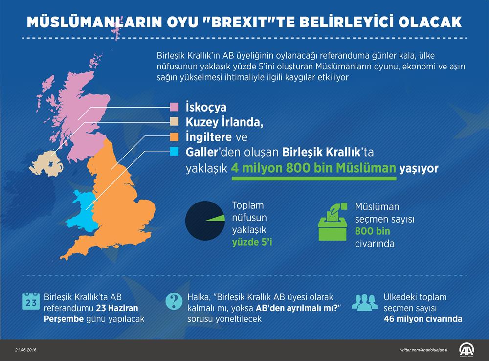 - İngiltere, Galler, İskoçya ve Kuzey İrlanda'dan oluşan Birleşik Krallık'ta yaşayan yaklaşık 4 milyon 800 bin Müslümanın referandumda vereceği oylar ülkenin AB ile ilişkisinde belirleyici rol oynayacak. Yaklaşık yarısı Birleşik Krallık'ta doğup büyüyen Müslüman nüfusun içinde 800 bin civarında seçmen bulunuyor.