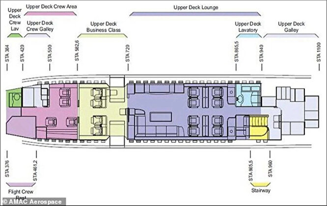 460'tan fazla yolcu kapasiteli günlük ticari 747'lerin aksine, bu jumbo jet uçağında yalnızca beş sıra standart business class koltuk bulunuyor.