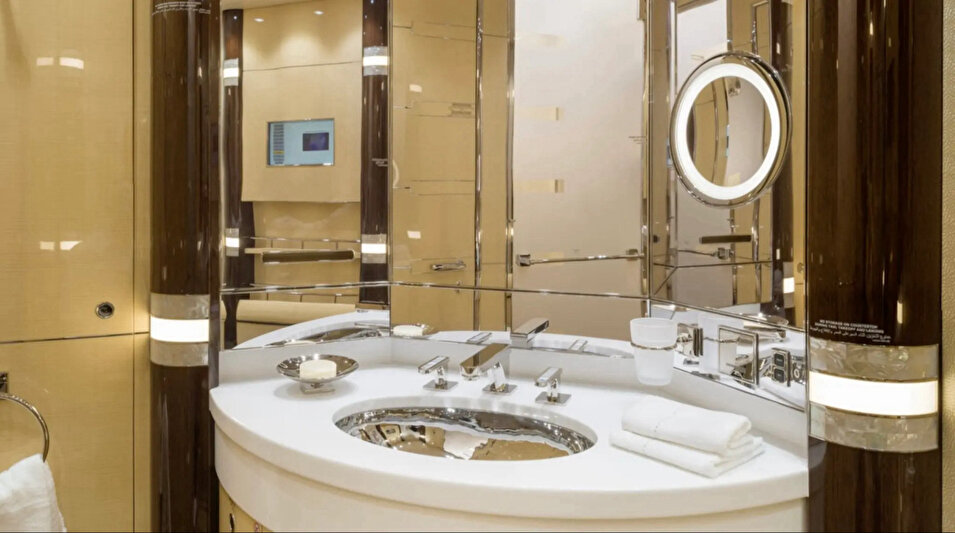 Uçaktaki hemen hemen her odada lüks halılar, deri koltuklar ve altın rengi mobilyalar bulunuyor.