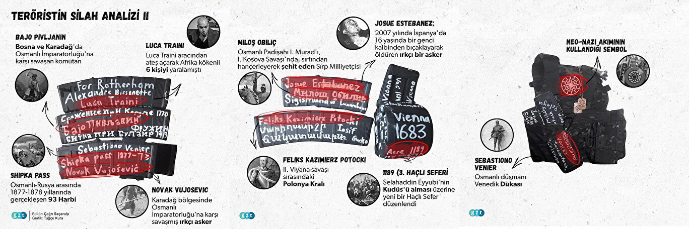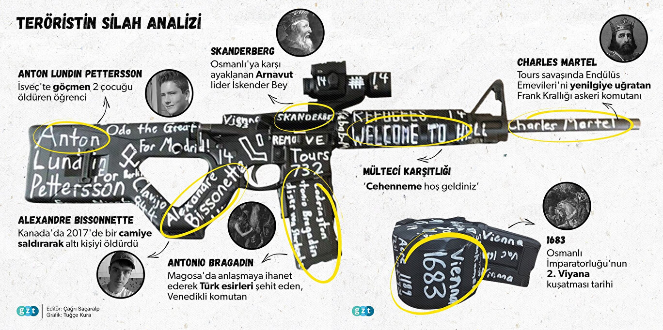 Teröristin katliamda kullandığı silah ve şarjörlerin üzerine yazdıkları ise İslam ve Müslüman nefretiyle yüklenmiş olduğunu gözler önüne serdi. Silahların dış yüzeyine yazılan notlar, tarih boyunca Müslümanlara saldıran figürlerin geçit resmi gibi. Osmanlı ve Türk nefretinin yoğun olarak gözlendiği mesajların uzun bir süredir özenle hazırlandığı anlaşılıyor. Katliam öncesi internet üzerinden 74 sayfalık bir de manifesto yayınladığı ortaya çıkan katil, Ayasofya’nın minarelerini yıkacaklarını iddia ederek başta İstanbul’u ve ‘Türkleri’ şöyle tehdit ediyor: “Topraklarınızda huzur içinde yaşayabilirsiniz, size zarar gelmeyecek. Boğaz’ın Doğu yakasında. Ama Boğaz’ın Batı yakasında bir yerde yaşamayı denerseniz, Avrupa’ya gelirseniz sizi öldüreceğiz. Konstantinopolis’e gelir, tüm cami ve minareleri yıkarız. Ayasofya minarelerden kurtulacak ve Konstantinapol hak edildiği gibi tekrar Hristiyan şehri olacak.”