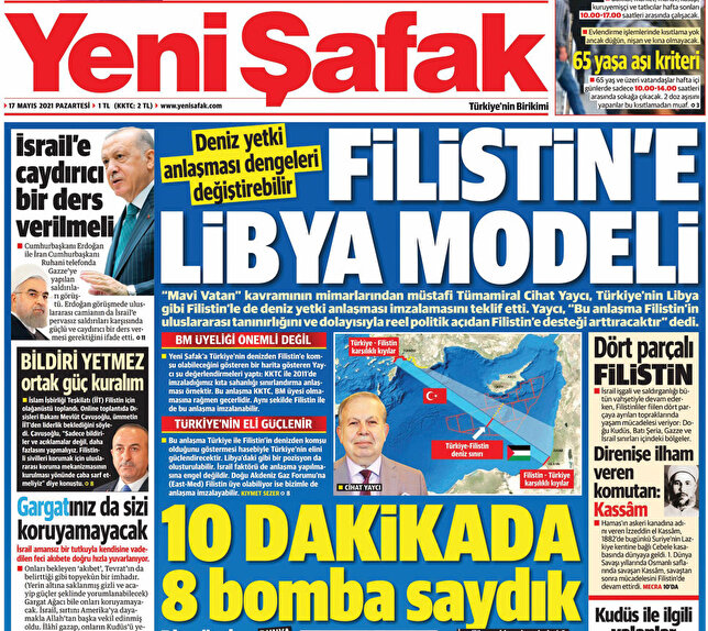 - Türkiye’nin Filistin’le deniz yetki anlaşması imzalaması gerektiği yönündeki açıklamaları ile İsrail ve Yunanistan’da gündem olan müstafi Tümamiral Cihat Yaycı, yürürlüğe giren anlaşmanın tarihi nitelikte olduğunu söyledi. Yaycı şunları kaydetti:“Anlaşma ile hem Türkiye Filistin’e olan desteğini ortaya koydu hem de yeni bir sayfa açıldı. Sahil güvenlik konusunda yapılması planlanan işbirliği ve tatbikatlar, Türkiye ile Filistin arasında deniz yetki alanın sınırlandırılması anlaşması için de zemin doğmuş oldu. Yani bu anlaşma Libya modelinin Filistin’de hayata geçirilmesi için ilk adım atılmış oldu, bu yolda önemli bir taş döşendi. Bölge kaynaklarından aldığımız bilgiler de Filistinli kardeşlerimizin Türkiye ile anlaşma istedikleri yönünde. Bu anlaşma imzalanırsa herkesin çıkarına olacak. İsrail 10 bin kilometrekare, Mısır 14 bin kilometrekare deniz alanı kazanacak.”