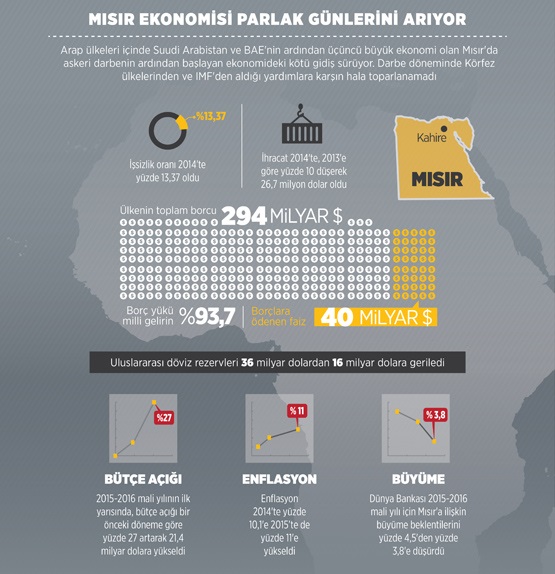 2013 yılında Abdülfettah El-Sisi komutasındaki askeri darbe yapılan Mısır'da darbenin ekonomik sonuçları en çok bu yıl hissedildi. Ülkede son 3 yılda 3 hükümet değişti. 3 hükümetin farklı farklı ekonomi politikaları uygulamaları, ve Ekim 2015'te Sina Yarımadası'nda Rus uçağının düşmesi ile turist sayısının yüzde 70'lere kadar gerilemesi ekonomiyi derinden sarstı.