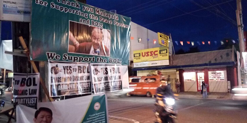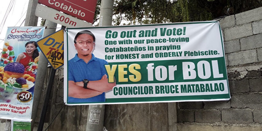 Cotabato'da tarihi referandum öncesi "evet" ve "hayır" oyu kullanılması yönünde çağrı yapan grupların kullandıkları afişler ve sloganlar şehrin genelinde dikkati çekiyor.