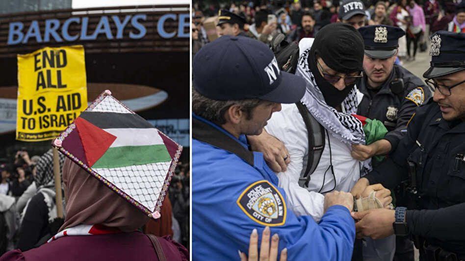 Barclays Center önünde toplanan Filistin destekçileri, İsrail aleyhine slogan atarken "Özgür Filistin" sesleri yükseldi. İsrail bayrağı taşıyan karşıt bir protestocu, Filistin destekçisi grubun arasına girerek gösteriyi provoke etmeye çalıştı.