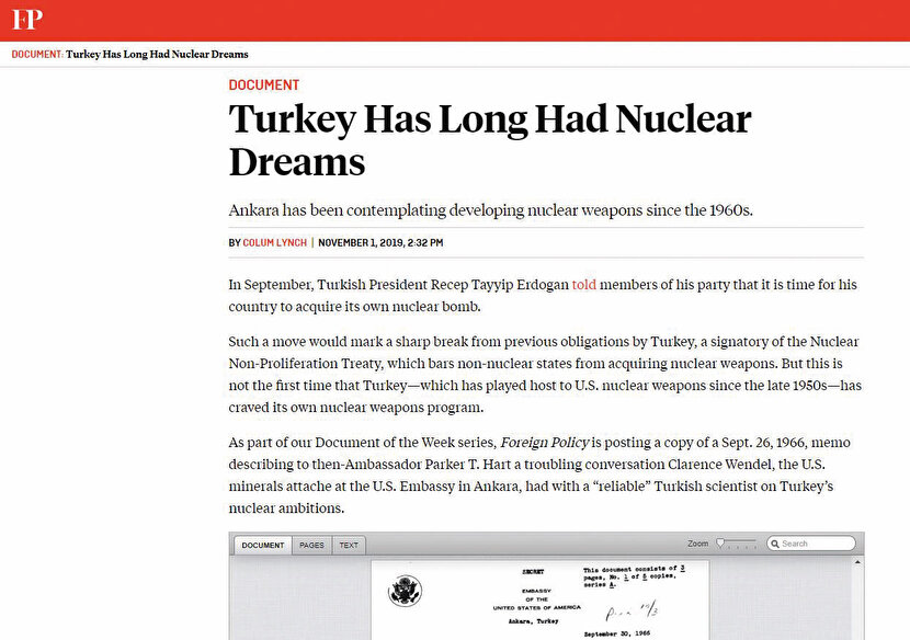 ABD ve İsrail, Türkiye’nin ‘gizlice nükleer silah ürettiği’ propagandasına başladı. ABD merkezli Foreign Policy’deki haberde, “Ankara, 1960’tan bu yana nükleer silah geliştirmeyi düşünüyor” denildi. Haberde Cumhurbaşkanı Erdoğan’ın nükleer silah çıkışına atıf yapılarak “Türkiye’nin nükleer isteği yeni değil” sözlerine yer verildi.