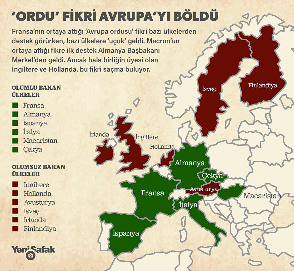 Fransa Cumhurbaşkanı Macron tarafından ortaya atılan 'Avrupa ordusu' fikri, AB'nin lokomotif ülkeleri olan Almanya, İspanya ve İtalya gibi ülkelerden destek bulurken, birliğin bazı ülkeleri tarafından 'uçuk' bulundu. Hollanda, Avusturya, İsveç ve İrlanda, bu fikre şiddetle karşı çıktı. AB, yeni bir bölünmenin eşiğinde.