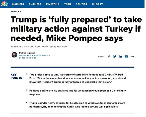 Amerikan CNBC televizyonu ABD Dışişleri Bakanı Mike Pompeo'nun, "Başkan Trump, ihtiyaç halinde Türkiye'ye askeri harekât yapılması için hazırlıklı" açıklamasını yaptığını belirtti. Ancak Pompeo'nun askeri müdahale konusundaki açıklamasında Türkiye'nin adını dile getirmediği ortaya çıktı.