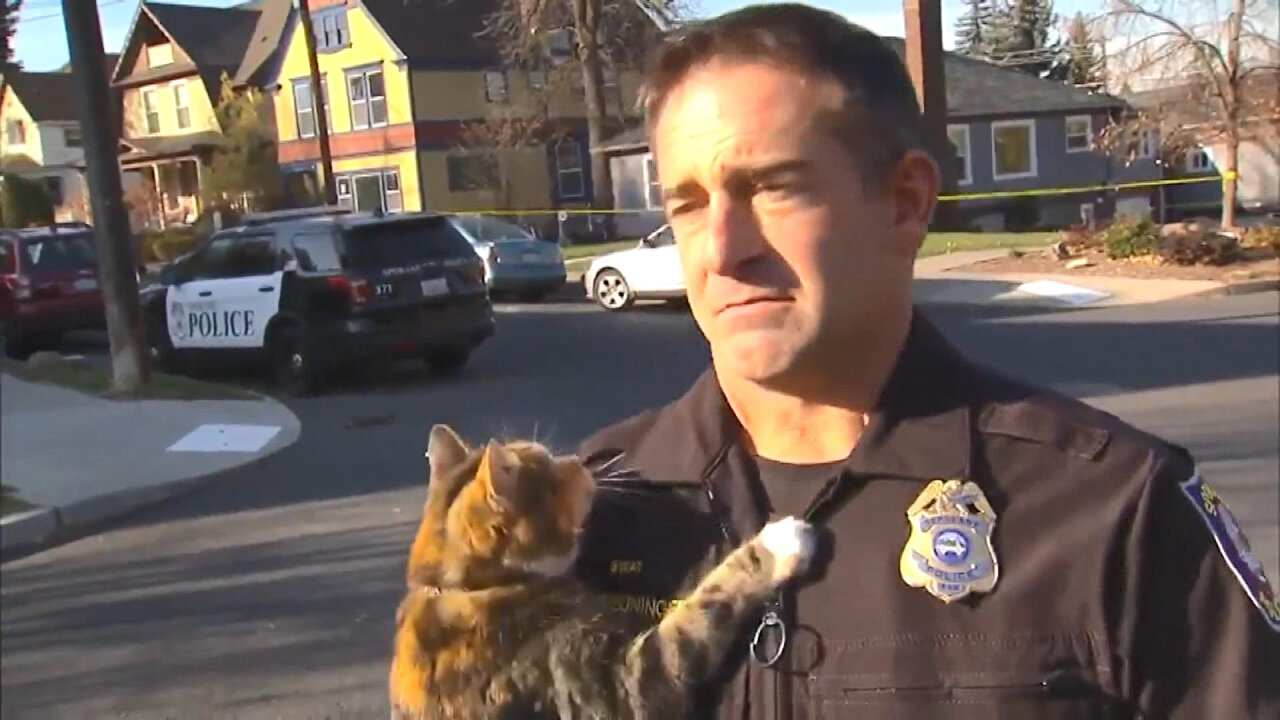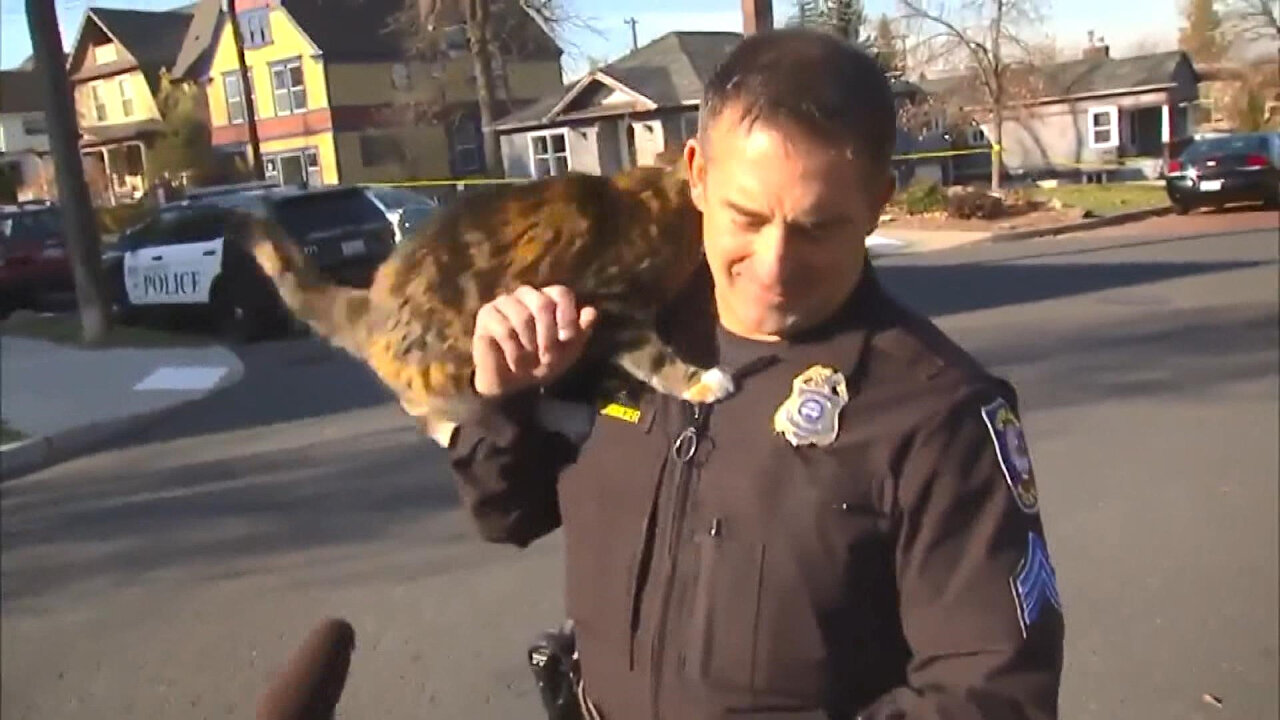 Kedinin üzerine tırmanarak omzuna çıkmasıyla şaşıran polis memuru, "Merhaba kedi" dedi. Daha sonra, "Seni yavaşça yere bırakacağım" dedi ve hafifçe eğilerek kedinin yere atlamasını sağladı.