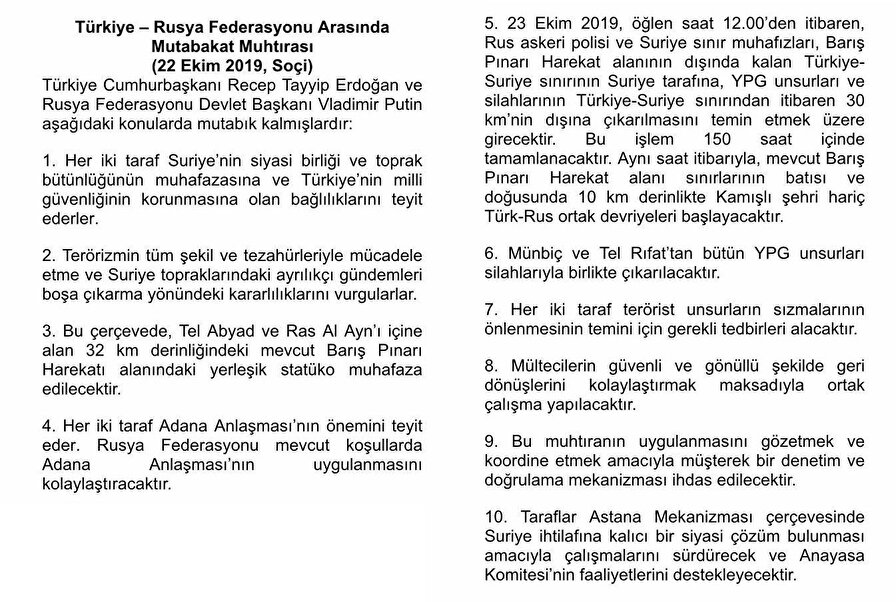 Barış Pınarı Harekatı ile Tel Abyad ve Rasulayn gibi bölgeler YPG'den temizledi. Türkiye, sınırın diğer bölgelerindeki YPG varlığı için Rusya ile masaya oturdu.